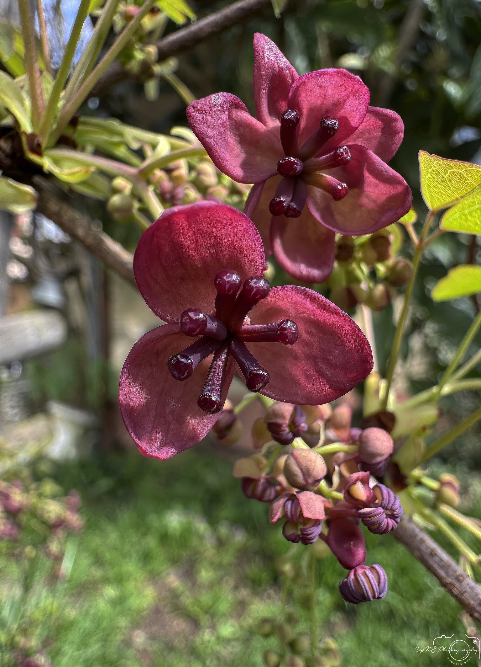 The Akebia quinata flower stands fully open, its deep burgundy petals unfolding to reveal the intricate beauty within. From a short distance, the blossom's rich color draws the eye, velvety and bold against the softer hues of surrounding foliage. Delicate inner structures are now visible, adding texture and depth to the bloom's striking form. In full bloom, the flower offers a quiet drama—elegant, mysterious, and undeniably captivating.