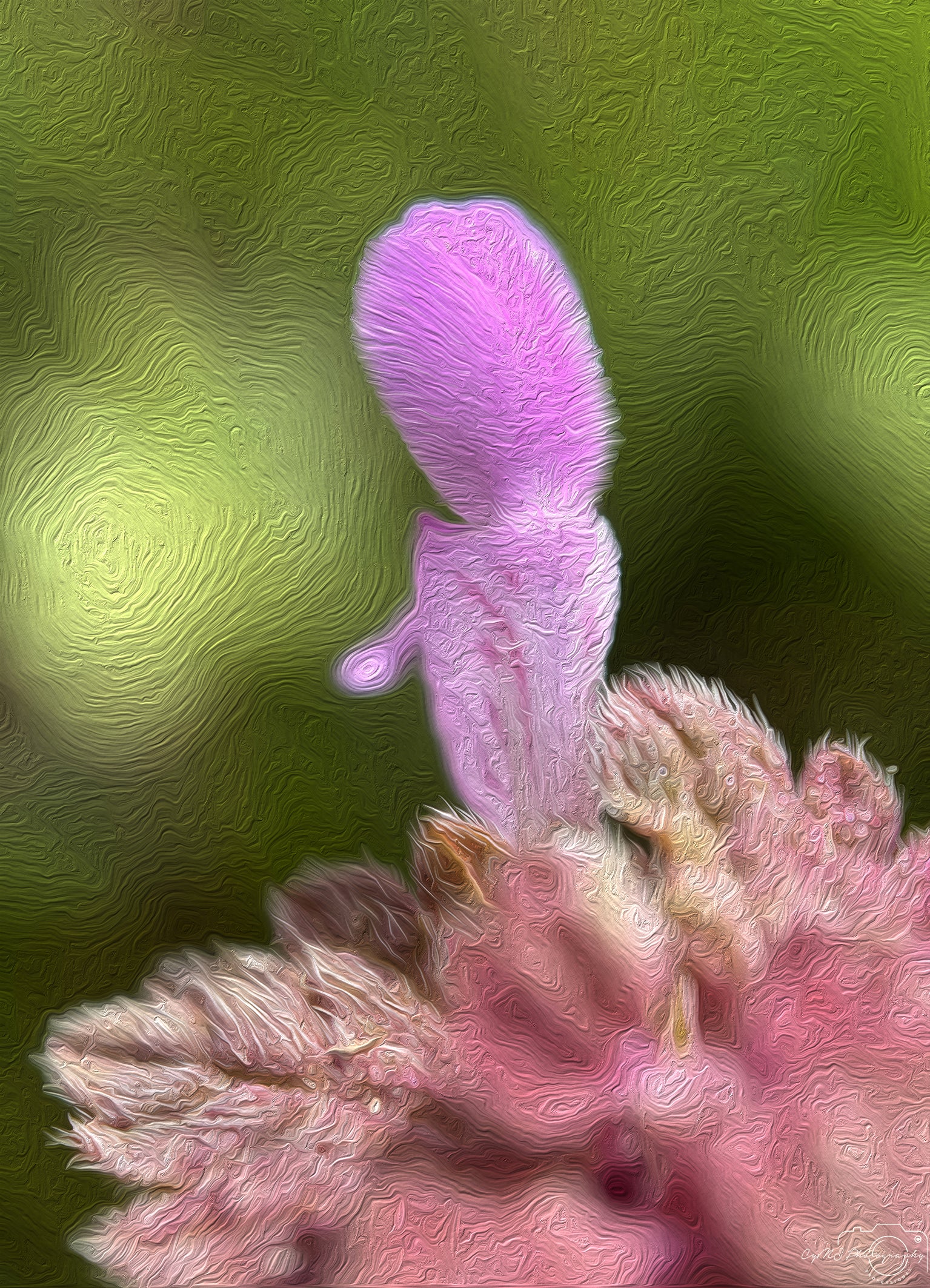 In this macro shot of Lamium purpureum, the flower appears as if it is surveilling its surroundings. Only the vivid pink part of the flower is visible, standing out with its vibrant color, while some of its beautiful, intricate leaves are also seen, adding texture and depth to the scene. The delicate pink petals create a striking contrast against the fine details of the leaves, giving the impression that the flower is quietly observing its environment, full of natural elegance.