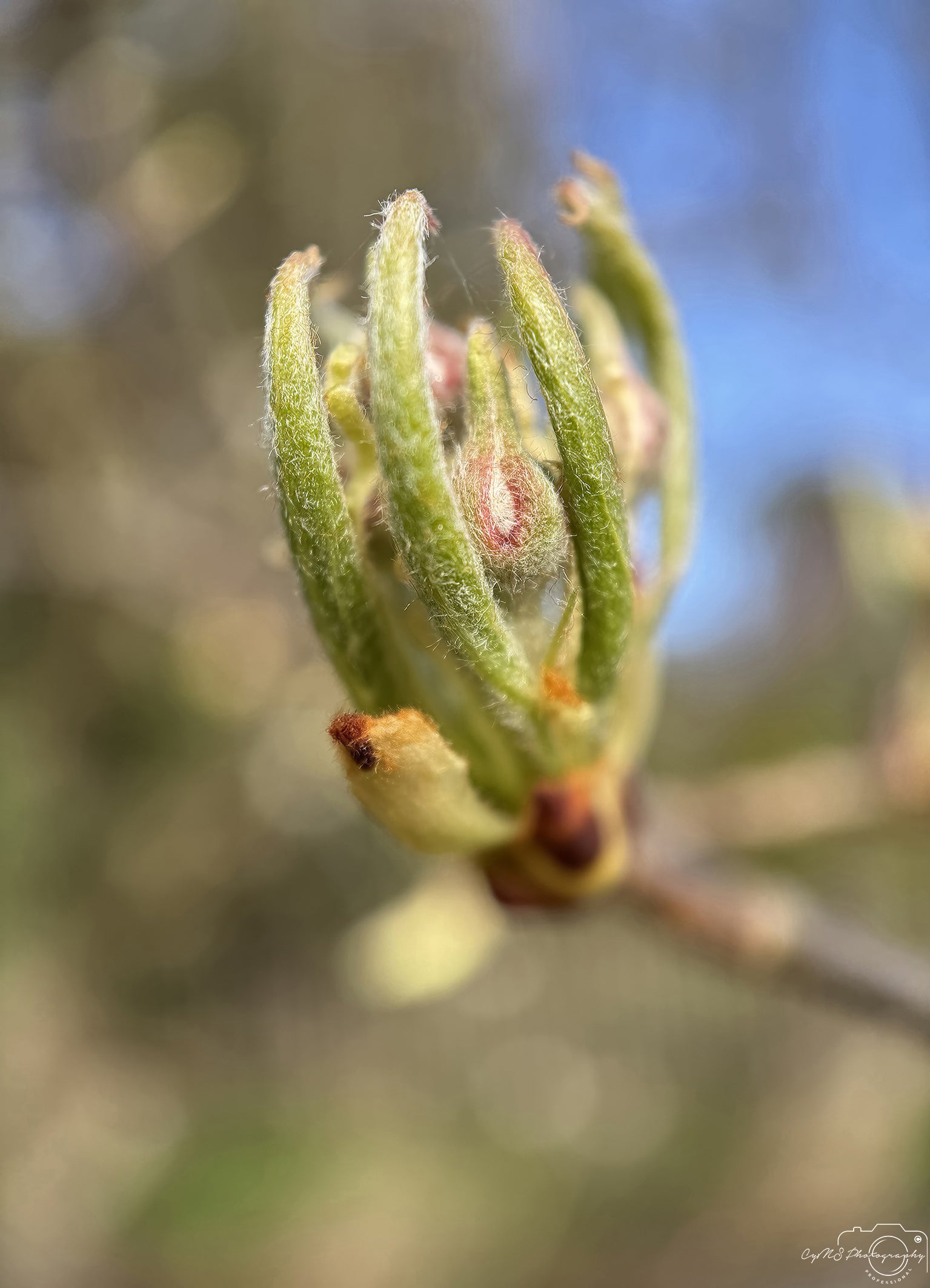 The buds of Pyrus communis are completely surrounded by claw-like leaves, which seem to serve as a protective guard around the tender buds. While this is merely an assumption, the sharp, curved shape of the leaves suggests they might be shielding the buds from the elements, ensuring their safety until they are ready to bloom.