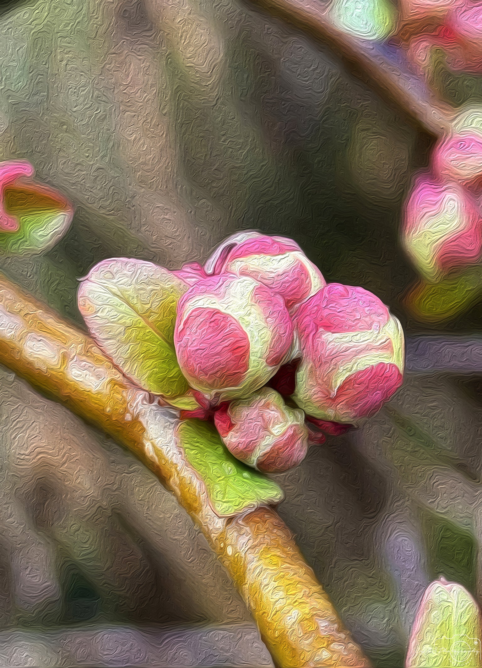 The Chaenomeles japonica buds resemble the perfect shape and design of tennis balls, their rounded form standing out beautifully. The colors range in various vivid shades of pink, with subtle hints of green. The soft, intricate design of the buds adds to the natural elegance, creating an amazing and serene atmosphere.