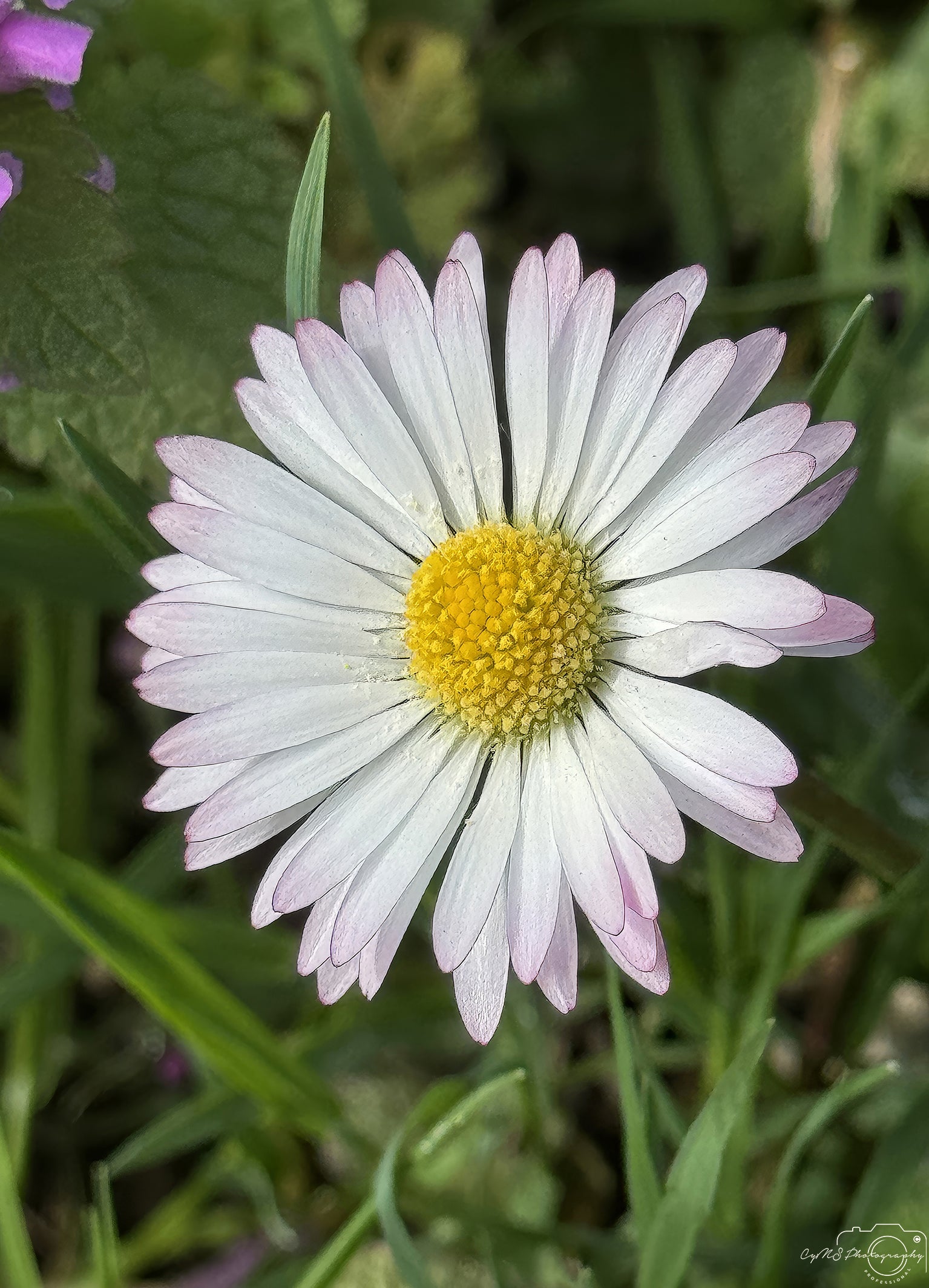 A front shot of Bellis perennis reveals the beautiful yellow center, which contrasts beautifully with the white and pinkish hues at the tips of the petals. The soft pink gradient delicately fades into the pure white, framing the vibrant yellow center. This simple yet stunning flower captures the essence of spring with its gentle color palette and intricate details, making it a captivating focal point in the scene.