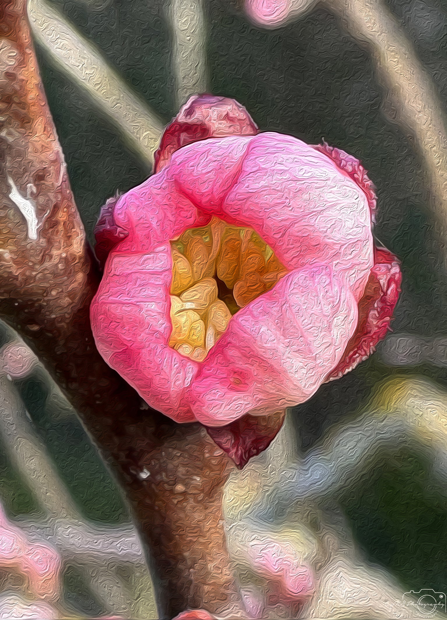 In this close-up shot, we see the delicate buds of Prunus armeniaca, with only the pink exterior and vibrant yellow interior visible. The soft pink petals frame the bright yellow center, creating a striking contrast that draws the eye. The rich colors and fine details of the bud’s structure make for an intimate and captivating view, showcasing the beauty of nature in its early stages.