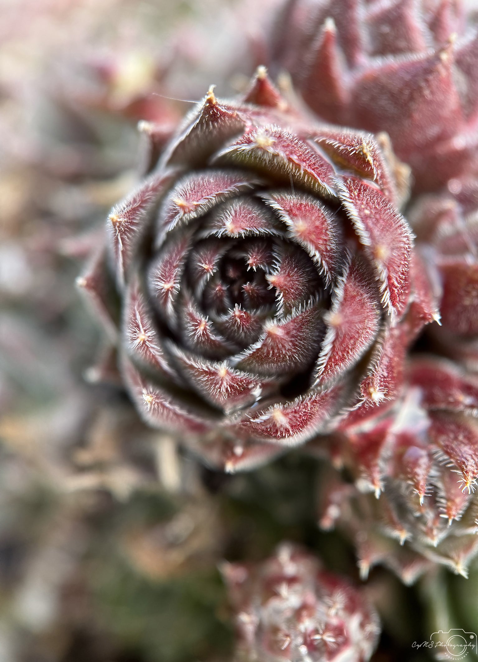 Sempervivum tectorum might resemble a cactus with its spiky, rosette-shaped leaves, but it is not. The plant's pointed leaves, tinged with a subtle red, form a dense, symmetrical cluster, giving it a bold, sculptural appearance. The soft red hues enhance its striking, almost otherworldly form. Though it mimics the look of a desert plant, it thrives in rocky, well-drained soils, showcasing its resilience and natural elegance.