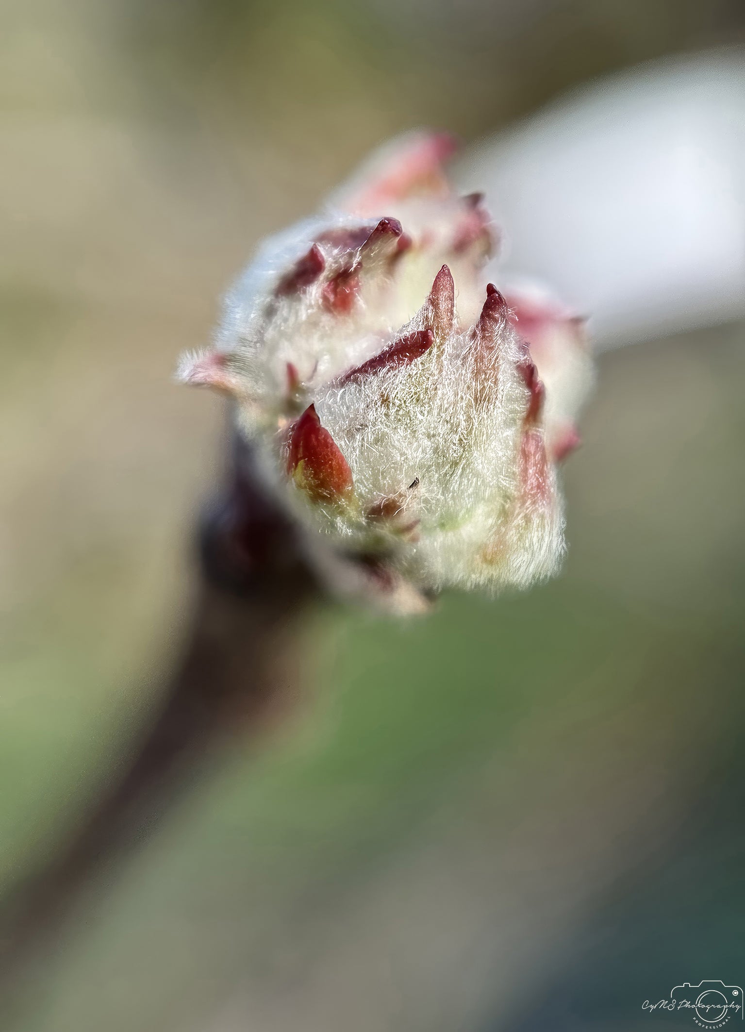 The buds of a Malus pumila are visible, their white color soft and delicate, almost as if coated with thick white feathers. Surrounding the buds are reddish, claw-like structures, adding an intriguing contrast to the soft white. The combination of the fluffy, feathery appearance and the sharp, claw-like edges creates a striking visual, giving the bud a sense of both gentleness and strength, as it awaits the moment to bloom.
