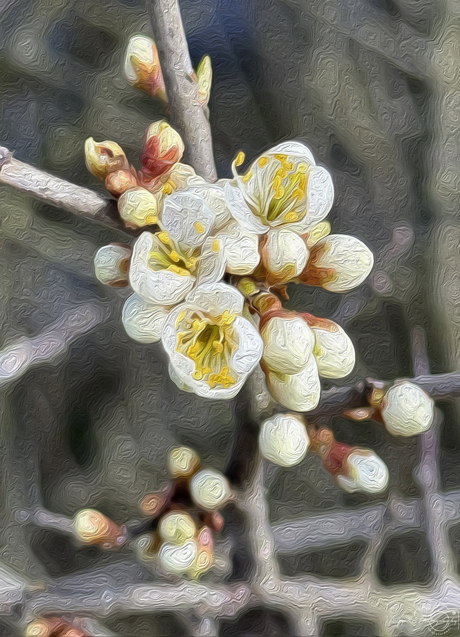 Here one can see a cluster of Prunus spinosa flowers, their delicate white petals creating a soft, ethereal display. At the center of each flower, the vibrant yellow of the stamens stands out, adding a bright contrast to the surrounding white. The cluster, with its intricate details, captures the simplicity and beauty of nature in full bloom, with the yellow centers offering a subtle yet striking focal point amidst the soft white petals.