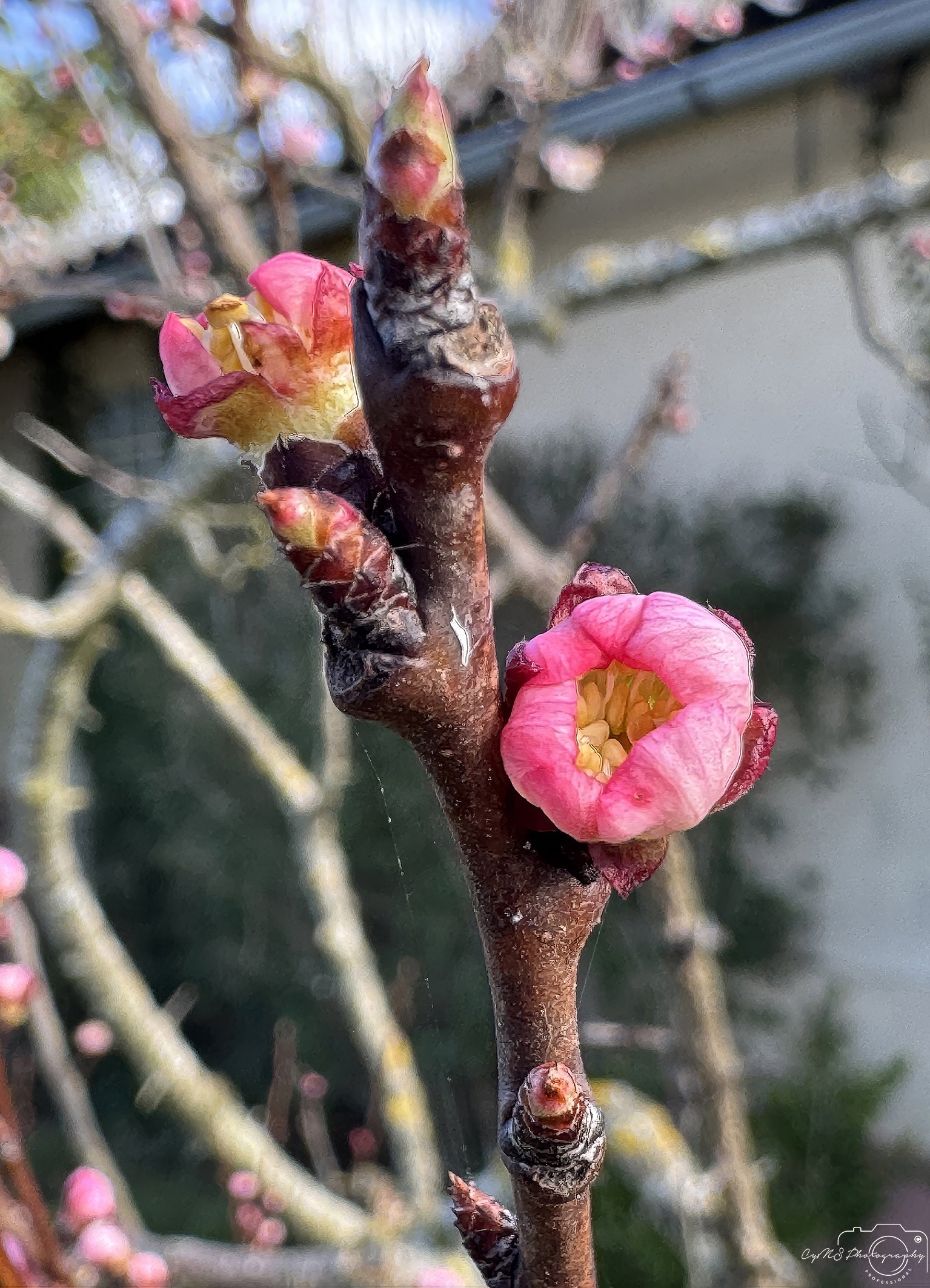 Some Prunus armeniaca buds, their delicate rose-colored petals just beginning to reveal their beauty. The soft pink exterior contrasts beautifully with the vibrant yellow interior that peeks through as the buds open. The combination of these warm colors adds a sense of vibrancy and anticipation, hinting at the full bloom that is soon to come. The gentle curves and promising hues make the buds a captivating sight, full of natural elegance.