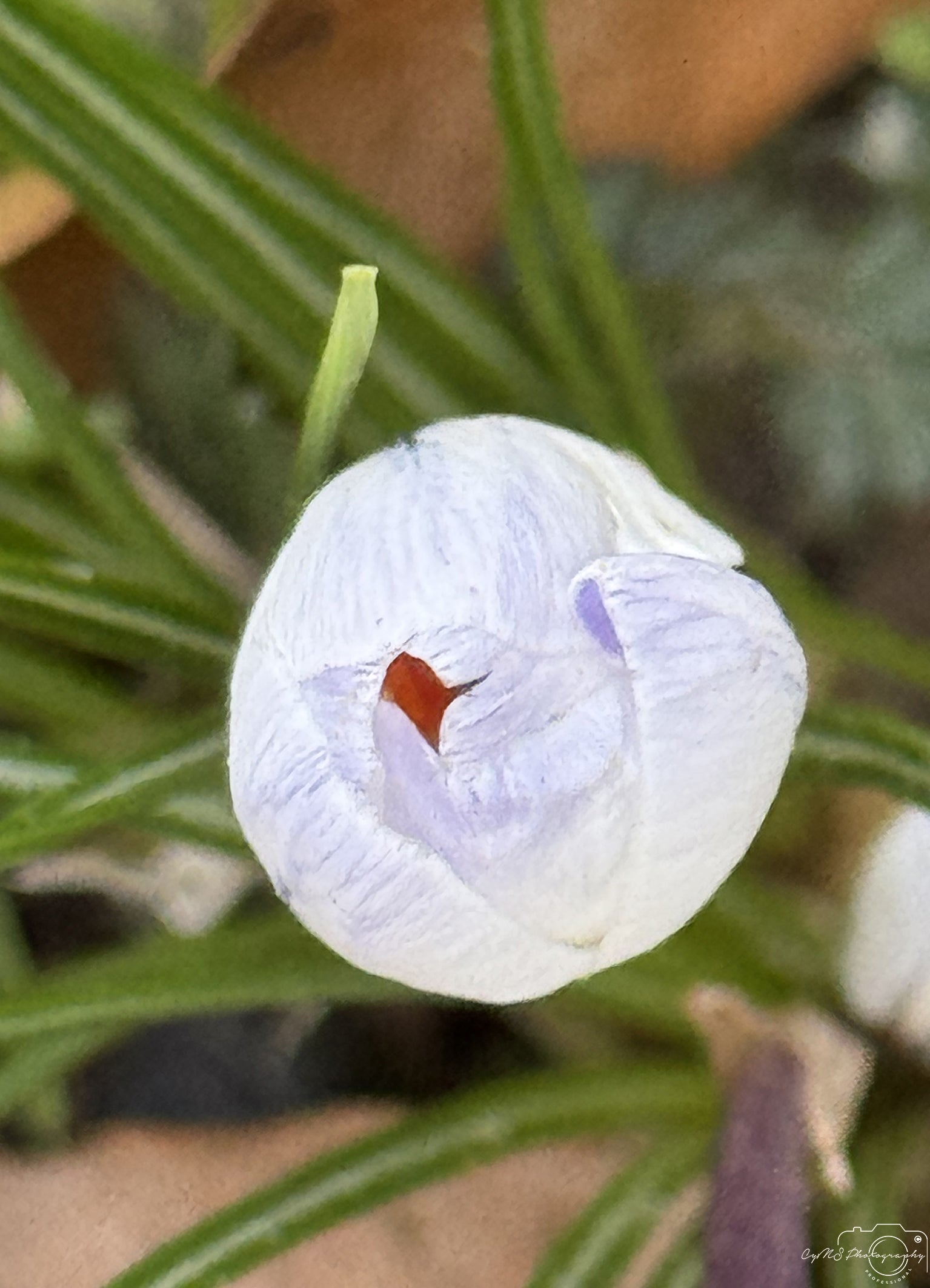 The shot was taken exactly at the zenith of a Crocus vernus, offering a unique perspective. Only a small see-through hole at the center reveals a glimpse of the flower's interior, while the rest of the bloom is dominated by the soft white and purple hues of the petals. The delicate colors blend seamlessly, creating a peaceful and refined visual. The play of light through the translucent hole adds a layer of mystery, drawing the eye deeper into the flower's intricate form.