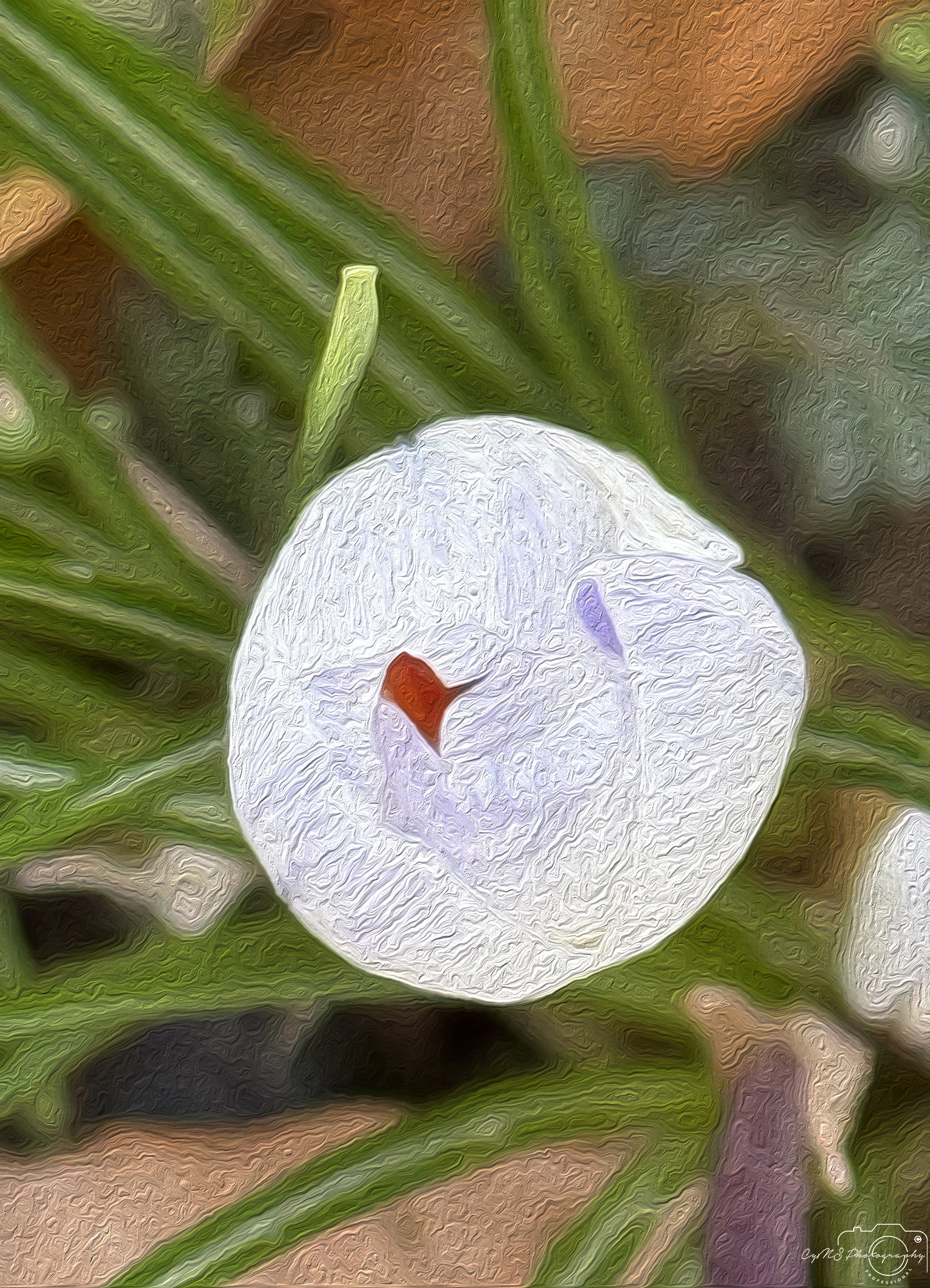 The shot was taken exactly at the zenith of a Crocus vernus, offering a unique perspective. Only a small see-through hole at the center reveals a glimpse of the flower's interior, while the rest of the bloom is dominated by the soft white and purple hues of the petals. The delicate colors blend seamlessly, creating a peaceful and refined visual. The play of light through the translucent hole adds a layer of mystery, drawing the eye deeper into the flower's intricate form.