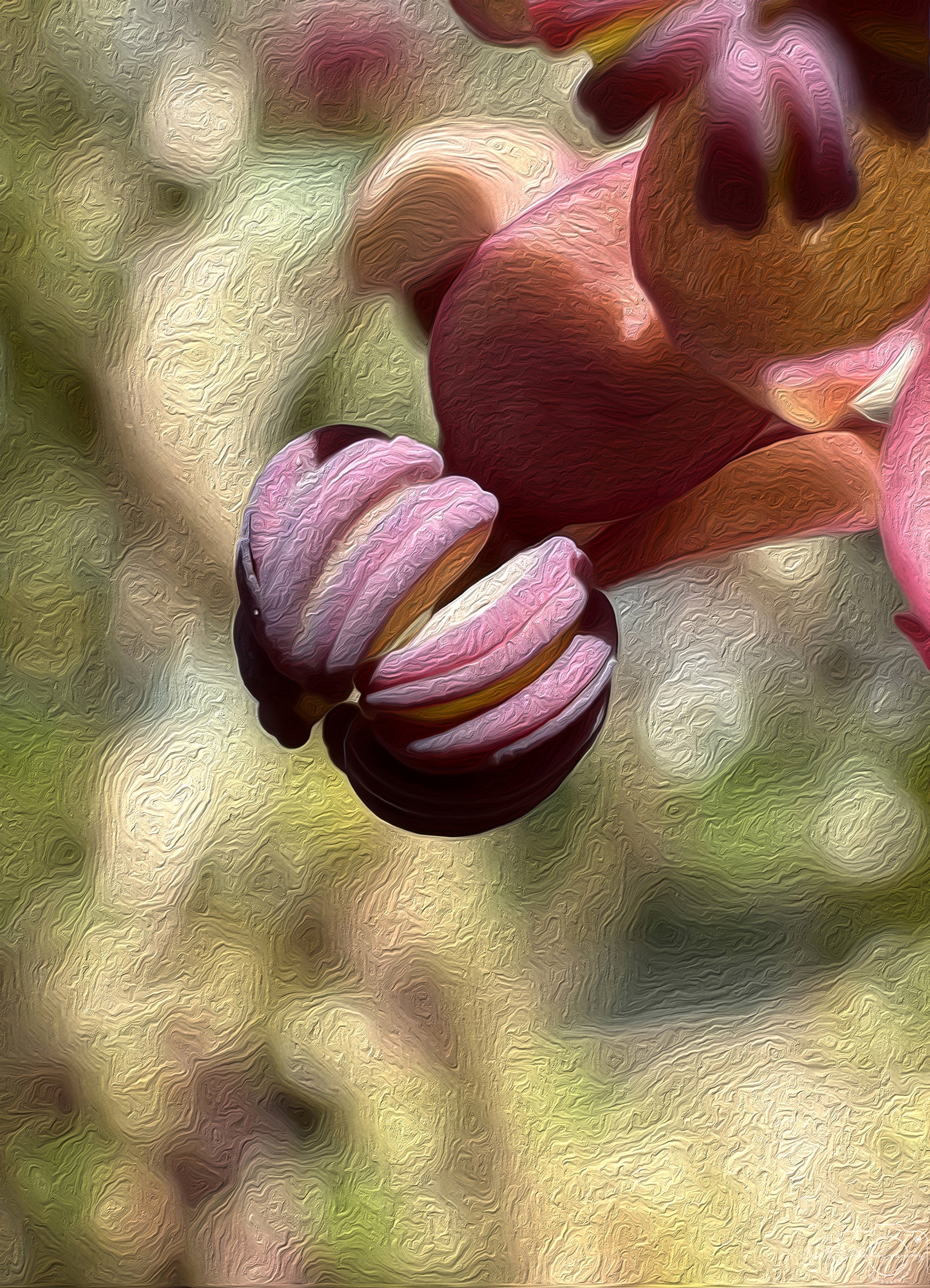 From a short distance, a cluster of unopened Akebia quinata buds hangs gracefully among foliage touched by light. The leaves shift in color from bright yellow-green at the center to soft pink and rich burgundy at the edges, creating a vivid backdrop. The flower buds remain closed, their rounded shapes gently suspended, hinting at the bloom to come. Even in this early stage, the plant radiates quiet elegance—layered in color, texture, and subtle anticipation.
