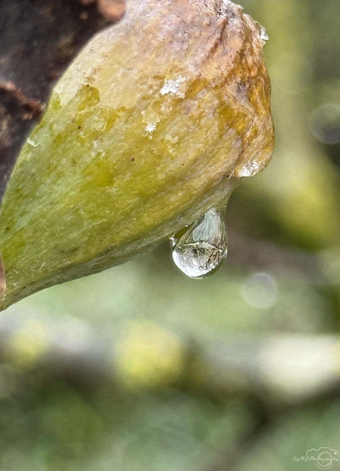 This exquisite drop of water rests gracefully at the bottom of a fig, a tiny world within itself. Its smooth, crystal-clear surface reflects delicate branches and lush herbs, creating a mesmerizing interplay of light and nature. A perfect harmony of detail and reflection, this drop transforms the ordinary into something truly captivating, making it an enchanting addition to any space.