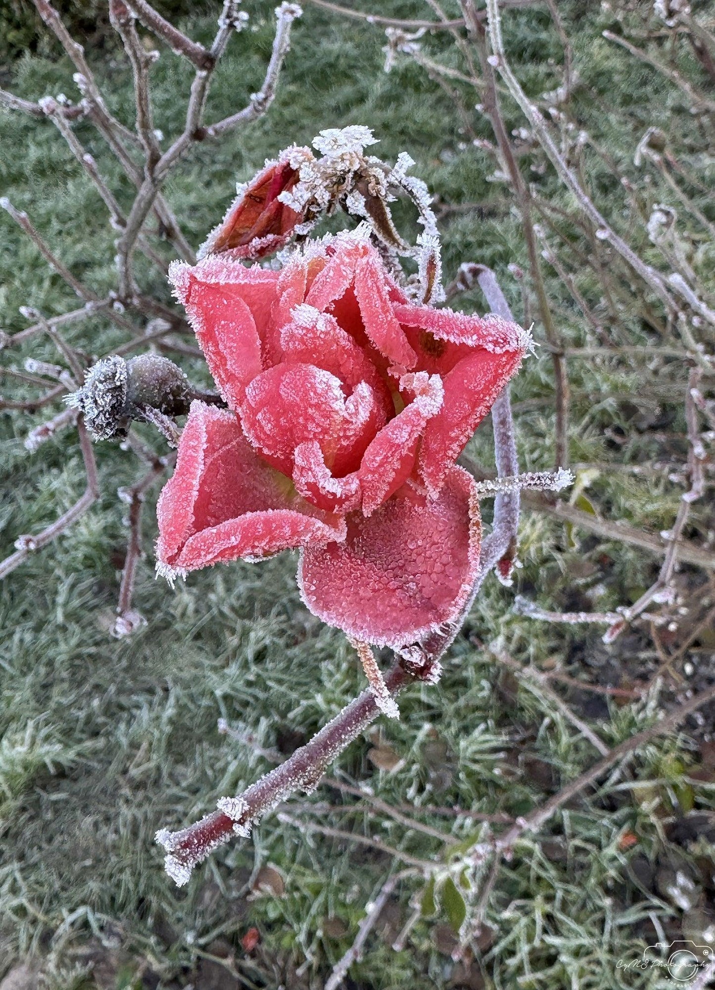 This striking rose, its vibrant red petals mostly encased in ice, stands as a testament to nature’s resilience in the face of harsh cold. The majority of the delicate petals are surrounded by a frosty shell, glistening in the still air. The sun has not yet risen, and the temperature is clearly far below zero, as the frozen beauty of the rose remains untouched by warmth. The contrast between the deep red of the petals and the icy embrace is both powerful and fragile, capturing a moment of stillness before the dawn’s arrival. It is a rare and mesmerizing sight—a flower preserved in time, frozen in the coldest of moments. Download the file today to bring this chillingly beautiful image into your life.