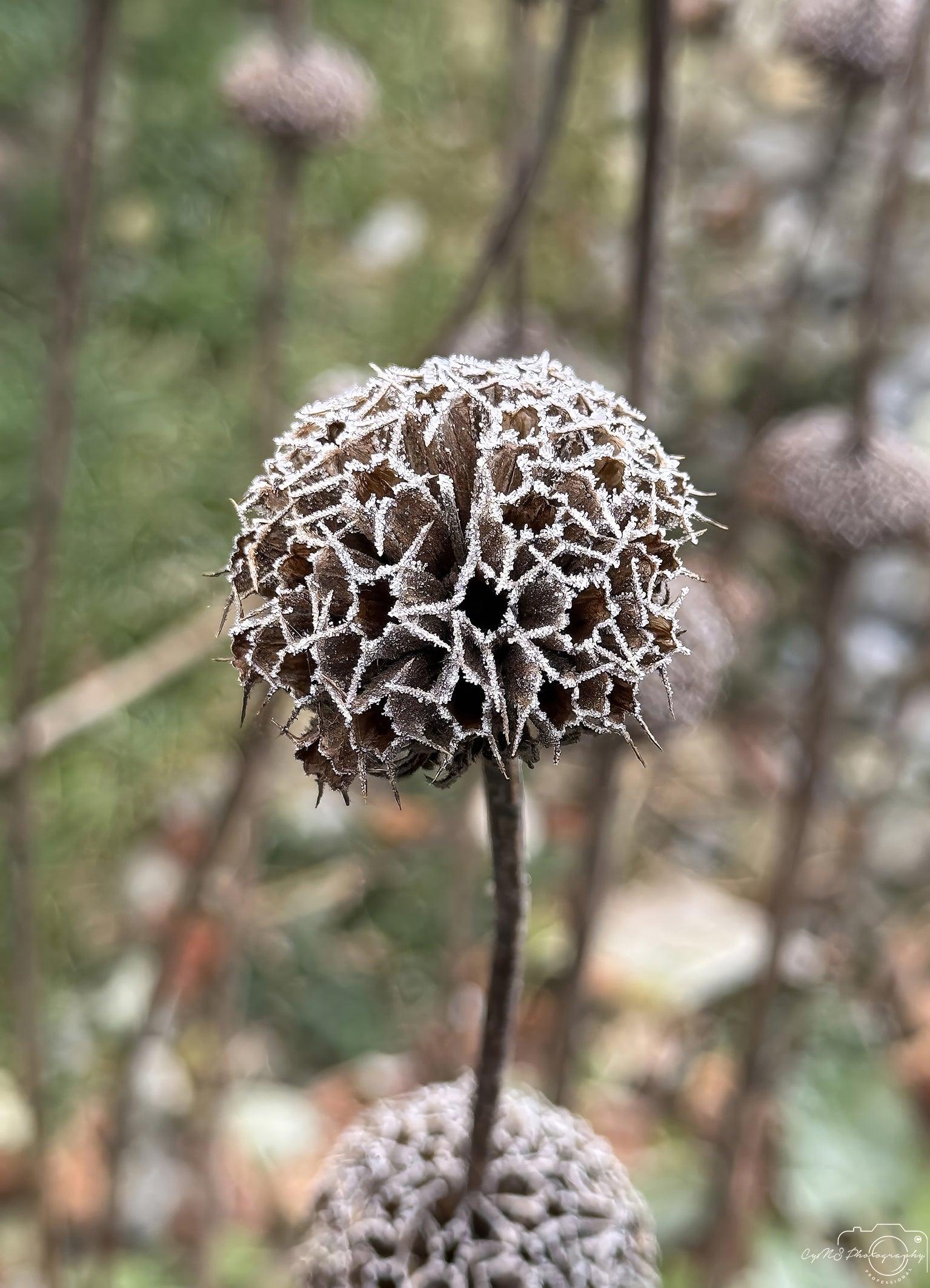 On a Phlomis fruticosa, a light morning frost clings to the branch, its delicate crystals shimmering in the early light. The plant’s distinctive structure, with its whorled flower heads, takes on an ethereal beauty under the icy coating. The frost highlights the intricate details of the plant’s form, bringing out stunning geometric shapes that seem almost sculpted by nature itself. The head of the plant, in particular, stands out as a mesmerizing display of symmetry and elegance, a fleeting masterpiece crafted by the crisp morning air.