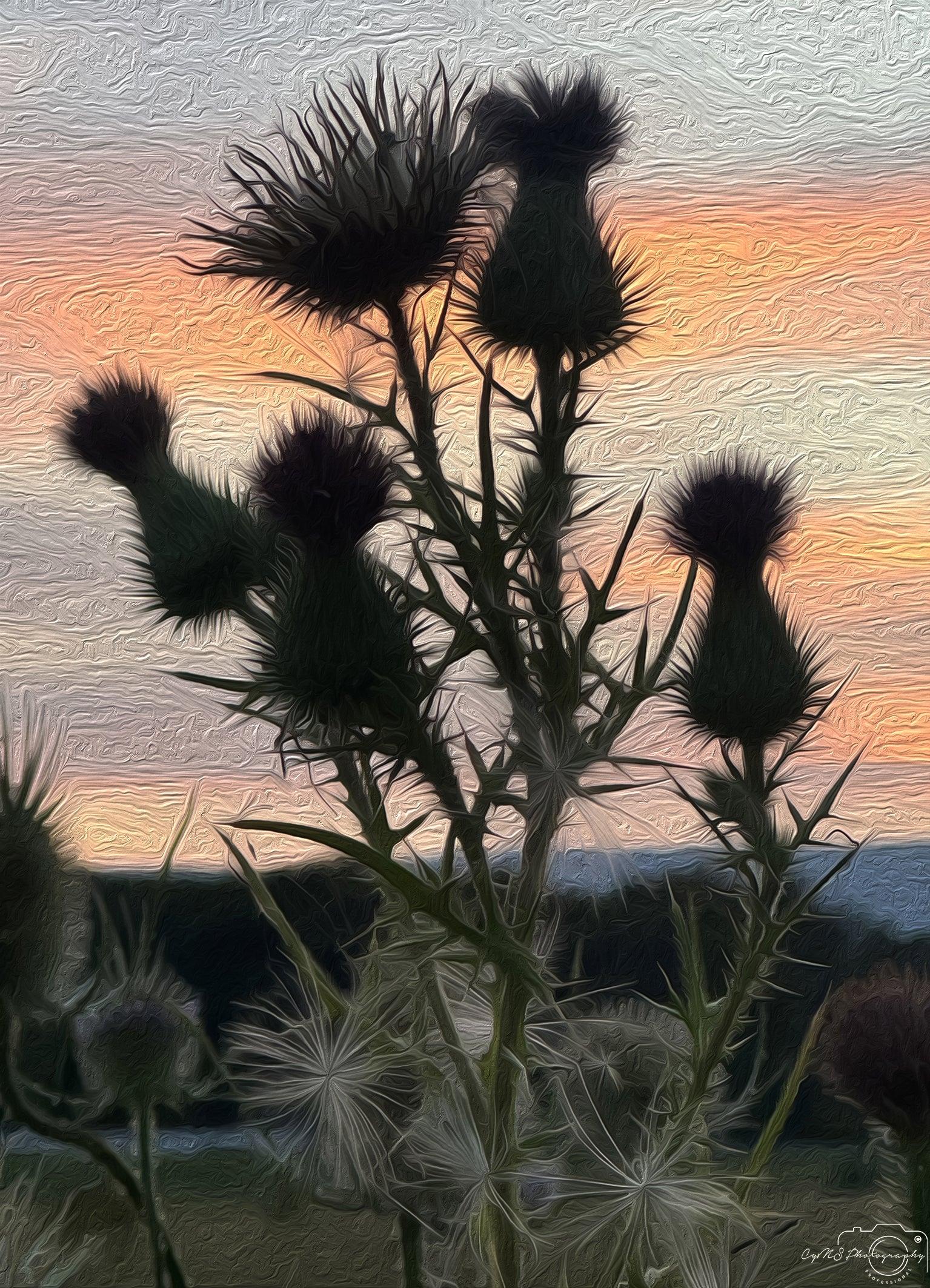 The sky glows with a deep orange hue, the clouds swirling in rich, fiery shades that stretch across the horizon in an almost surreal dance. The sun, though hidden, radiates its warmth, casting a soft glow over the landscape. In the foreground, sharp, thorn-like flowers with jagged tips rise, their striking forms both beautiful and dangerous. Their outlines are crisp against the glowing sky, adding a touch of eerie elegance to the scene. The lone silhouette of a tree stands to one side, its dark branches framing the mesmerizing landscape as the world seems to hold its breath in the embrace of the breathtaking sunset.