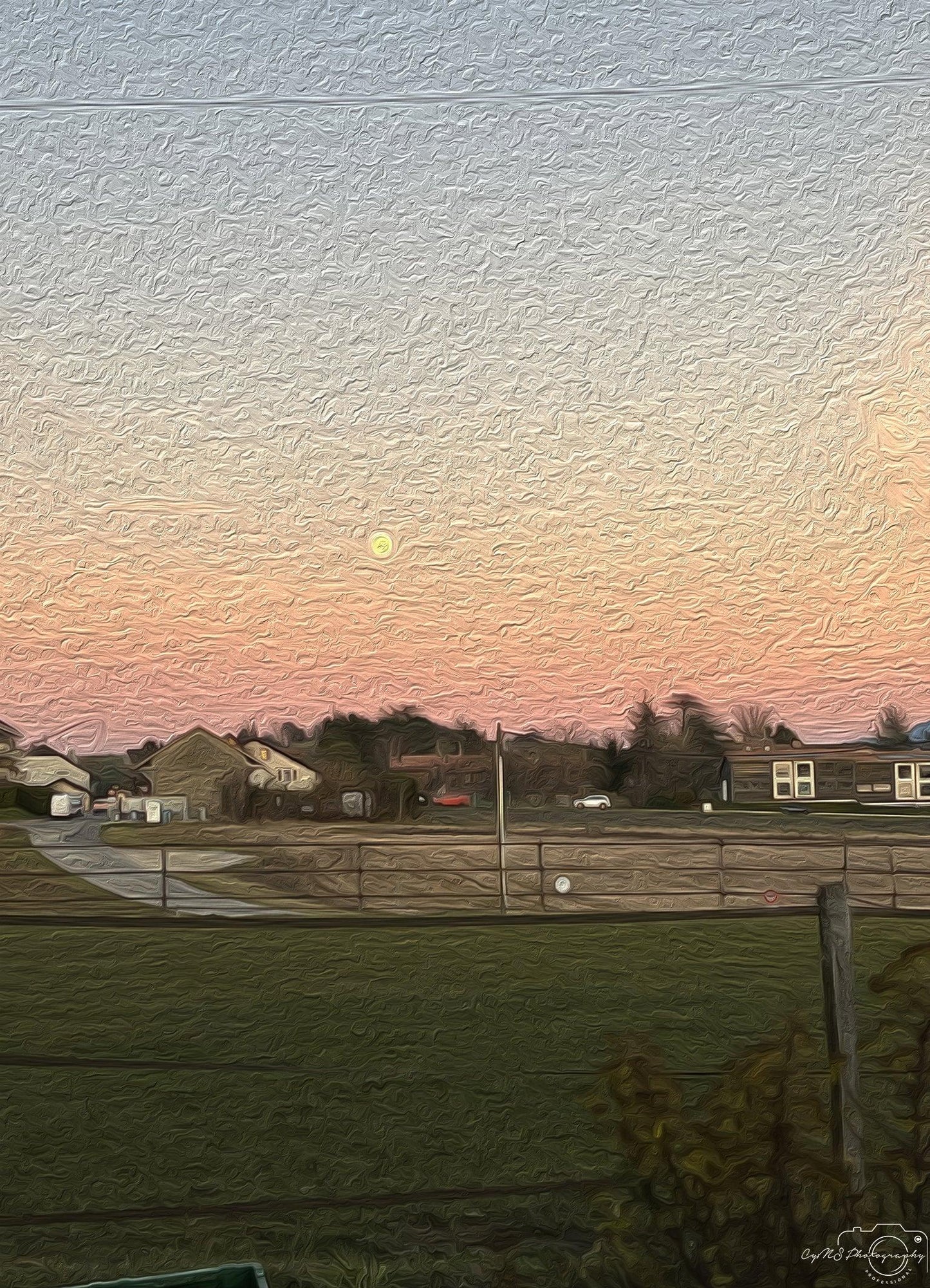 The moon appears at the center of the scene, its faint shape resting quietly in a sky washed in a rare pink hue. Soft gradients of pink, lavender, and gold blend seamlessly, creating an otherworldly atmosphere. The peaceful landscape below is bathed in the soft, approaching light of the moon, adding a tranquil and almost surreal beauty to the scene. The moment feels suspended in time, as the world patiently awaits the moon’s full brilliance, casting a calm and mesmerizing glow over the land.